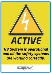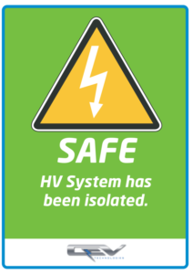 The green SAFE sign identifies that the HV system has been isolated from all dangerous voltage sources and all safety systems are functioning properly. There are no risks and visitors may be in the work area.