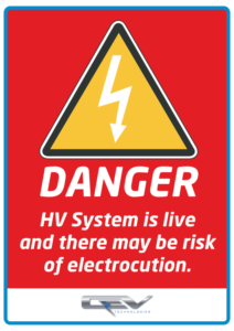 The red DANGER sign identifies that the HV system is active and there may be a risk of contact with a circuit. Only personnel trained with the appropriate safety equipment can work in the area. This sign will only be displayed during system tests or other specific work for a limited period. No visitor or untrained staff may enter the restricted area.