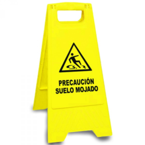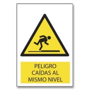 The sign DANGER OF FALLING AT THE SAME LEVEL identifies the risk of falling by slip or trip in the entire work area, possibility of the presence of wet soils, by stumbling with obstacles, or by irregularities in the ground.