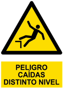 The DIFFERENT LEVEL DANGER sign identifies the risk of falling in the workplace due to interior and exterior stairs, as well as external fixed ladders, or other obstacles with a visible slope.