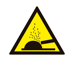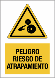 The TRAPPING HAZARD sign indicates that there is a risk of entrapment caused by elevator doors, automatic sliding doors, swinging doors, or using work equipment with accessible moving parts due to not having guards or safety devices or These are removed or violated.